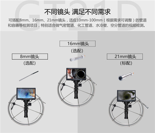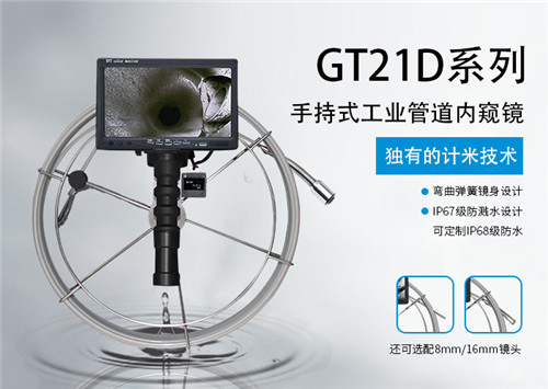 簡介——GT21D系列國產工業內窺鏡是一款手持一體設計的工業管道內窺鏡,鏡頭采用彈簧身設計,能夠輕松檢測其他設備無法進入的彎曲狹