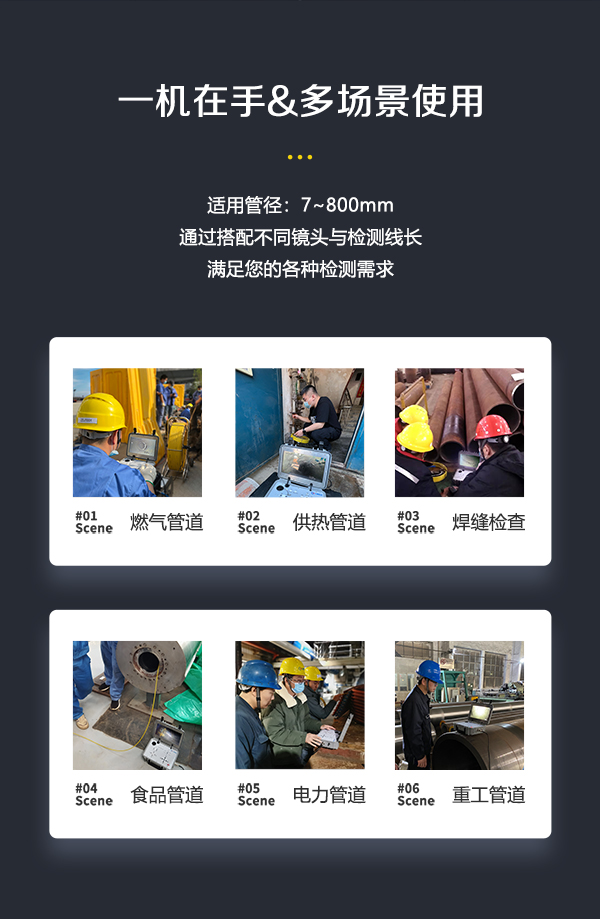 GT200HD系列高清工業內窺鏡通過全景鏡頭在管道內部的全方位觀察,將檢測圖像數據傳輸至控制主機。此外,搭配勾頭鏡可進入狹窄彎曲的空間,輕松應對各類復雜工況。鏡頭軸向360°無限旋轉,徑向220°翻轉,檢測無死角,HD高清畫面實時顯示內部工況。適用于7-800mm直徑的管道、容器等工況檢測,及時記錄并存檔工況內部的裂紋、腐蝕、堵塞、焊縫、異物等缺陷。